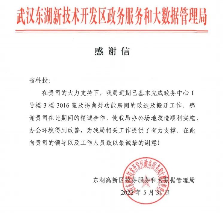 近日,科投集團收到來自武漢東湖新技術開發(fā)區(qū)政務服務和大數(shù)據(jù)管理局(以下簡稱“政數(shù)局”)的一封感謝信。信中表示,集團下屬光谷資產(chǎn)公司用心為在管項目提供服務保障,通過一系列舉措大大改善了項目整體運營環(huán)境,為相關工作的開展提供了有力支撐,信中向相關負責人及工作人員表達了誠摯謝意!